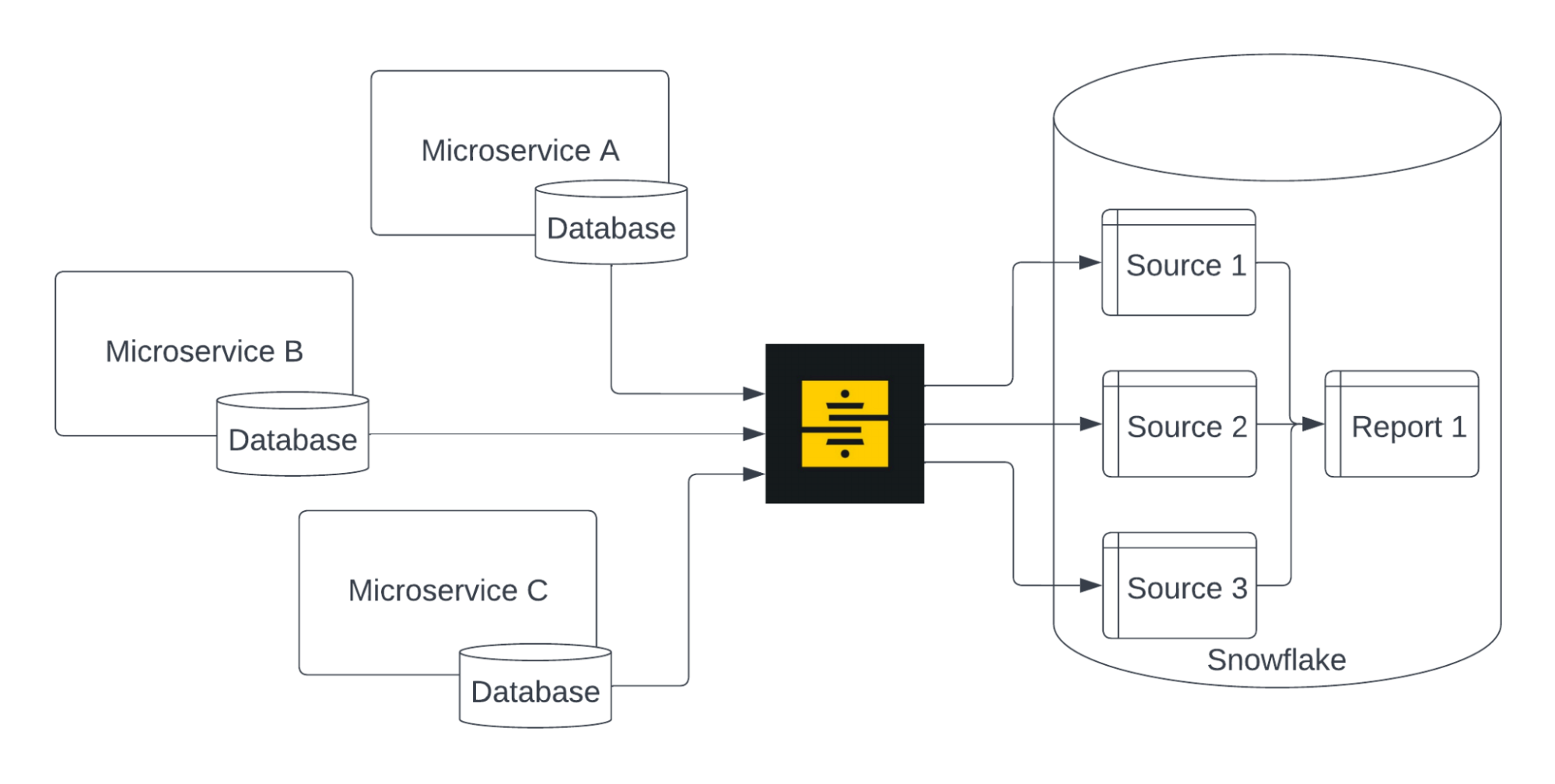 In the past we relied upon an ETL tool (Stitch) to pull data out of microservice databases and into Snowflake. This data would become the main dbt sources used by our report models in BI.